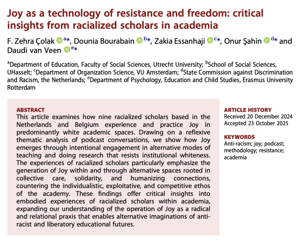 Çolak, F. Z., Bourabain, D., Essanhaji, Z., Şahin, O., & van Veen, D. (2025). Joy as a technology of resistance and freedom: critical insights from racialized scholars in academia. Ethnic and Racial Studies.