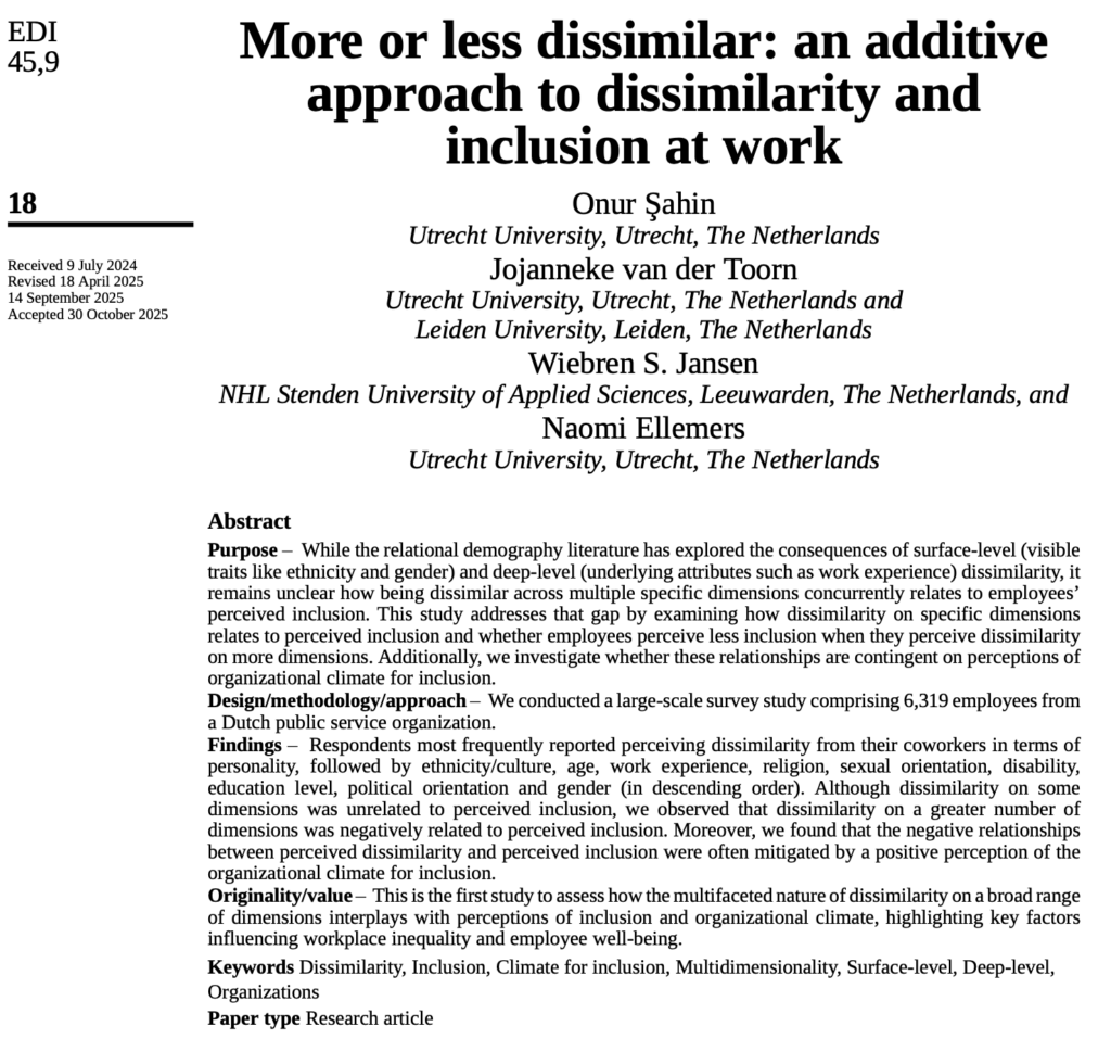 Şahin, O., Van der Toorn, J., Jansen W.S., & Ellemers, N. (2026). More or less dissimilar: an additive approach to dissimilarity and inclusion at workEquality, Diversity and Inclusion: An International Journal, 45(9).